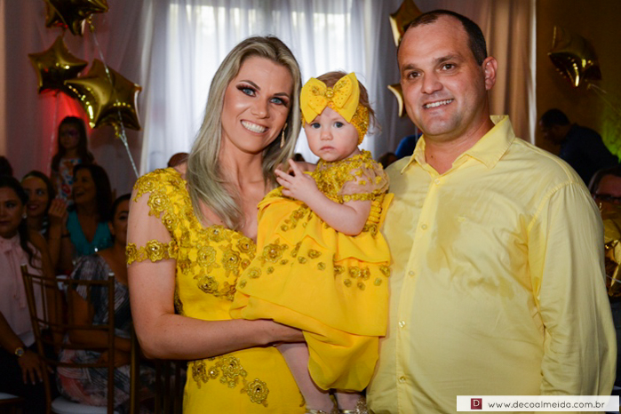 Vestiu amarelo ouro,e foi apresentada pela mana Maria Eduarda que cantou e improvisou acordes de piano, anunciando a chegada da aniversariante.