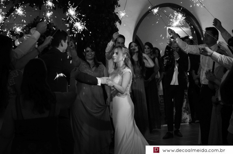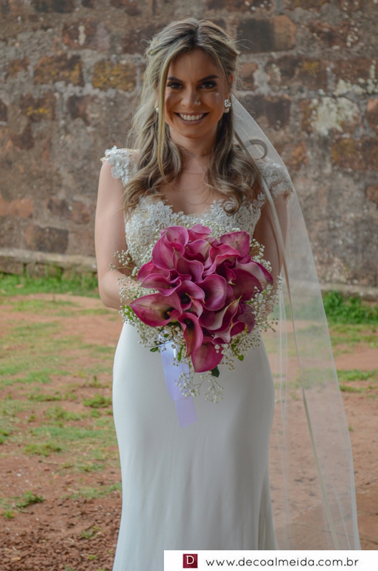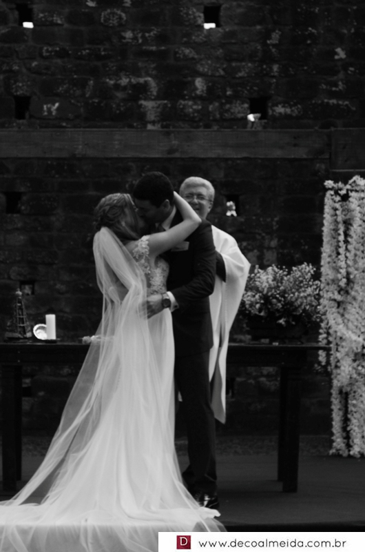 A noiva estava esplêndida com modelito em tela chantilly e aplicações de renda rústica, criando efeito tatoo e cinto bordado de cristais swarovski.