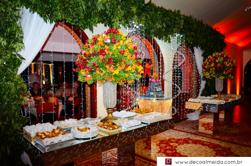 O salão de eventos do Hotel Tenondé foi o espaço escolhido por seu charme e paisagismo para a comemoração do enlace, com espaços demarcados para os convidados e um serviço corretíssimo de garçons servindo drinks em ambiente dos mais sofisticados e requintados para tão importante ocasião.