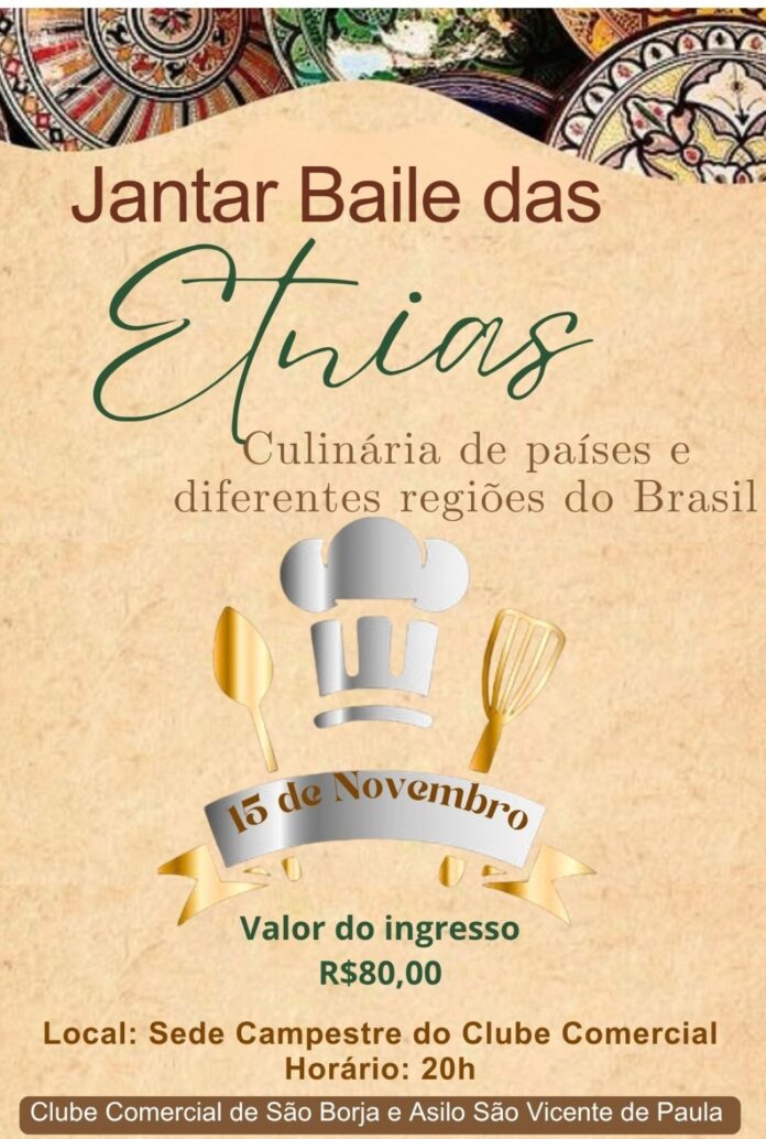 Estão a mil por hora os preparativos para o segundo Jantar das Etnias, no Clube Comercial, no dia 15 de novembro, na sede campestre. O evento reunirá pratos típicos regionais, nacionais e internacionais preparados com muito carinho pelos participantes, em prol de uma causa justíssima, o Asilo São Vicente de Paula presidido por Paulo Streck. Tudo indica que será um momento único e imperdível!