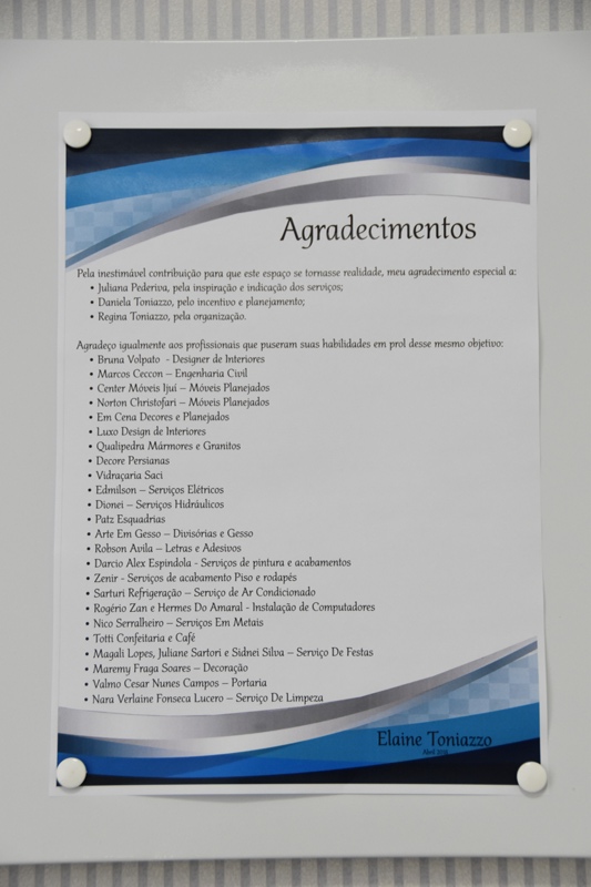 O ambiente é um dos mais bacanas e muito bem projetado, onde Elaine poderá desenvolver seu trabalho, enaltecendo seu capacitado e notável conhecimento em serviços pedagócigos, voltados a área da psicopedagogia.