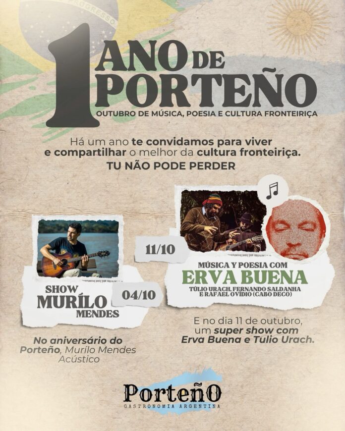 O Porteño capitaneado pelo Felipe Moraes completando um ano neste sábado. E num lance muito criativo oferecerá uma noite de convivência do melhor da cultura fronteiriça, com muita música e poesia, além do acústico de Murilo Mendes. E o cardápio é um dos mais típicos proposto pela charmosa gastronomia da casa. E para o dia 11 o Porteño anuncia a apresentação de Erva Buena com muita música Y Poesia.