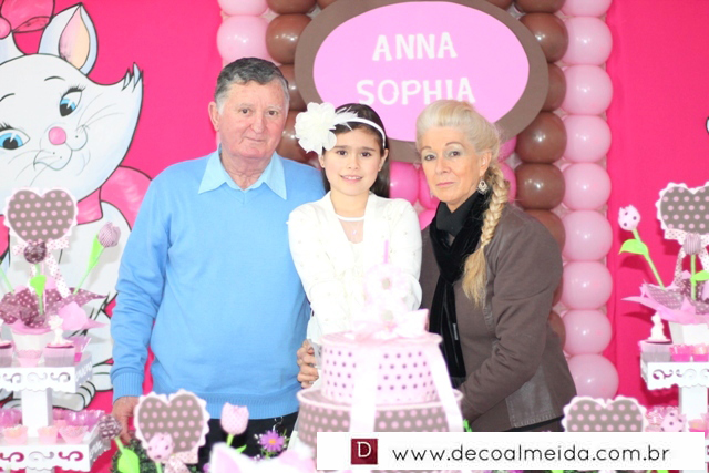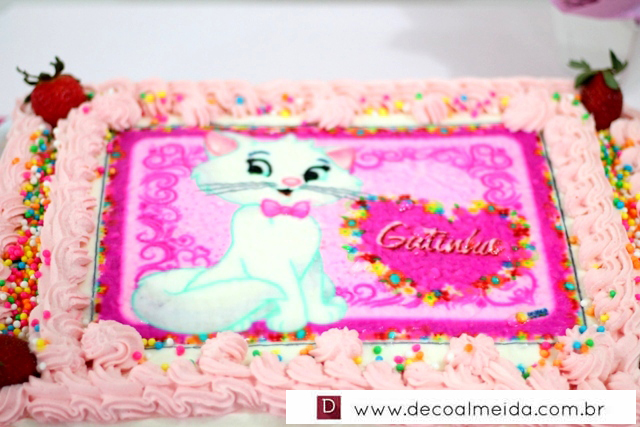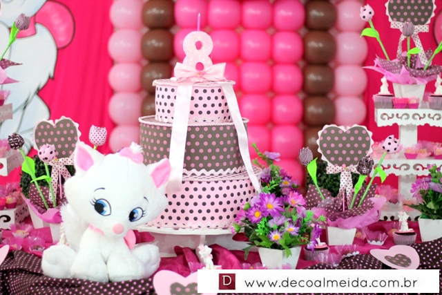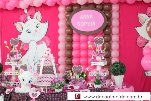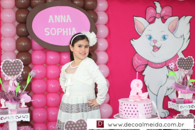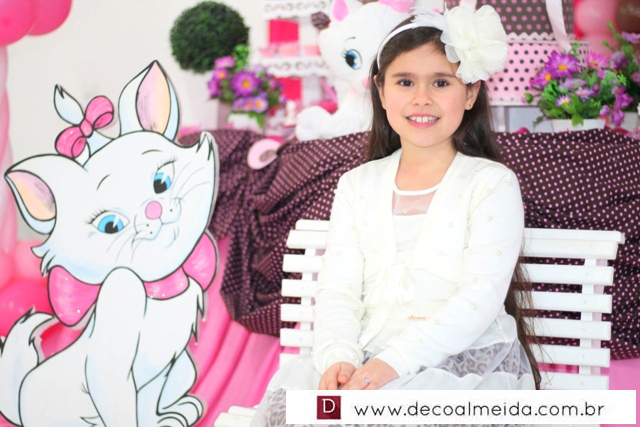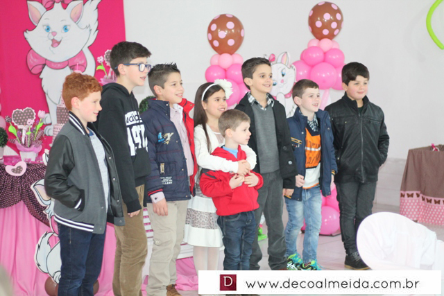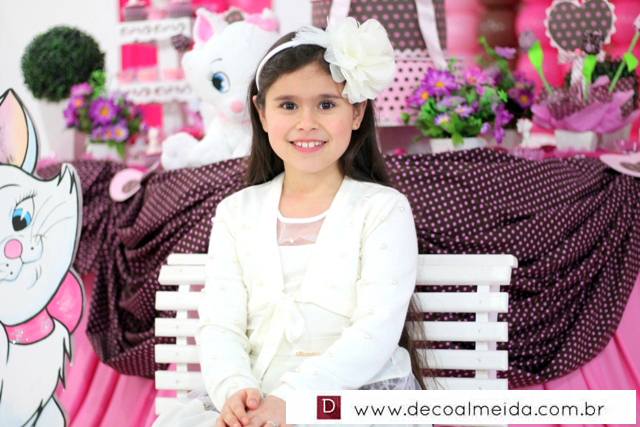 Ambiente decorado com motivos de Marie tudo em cor de rosa, serviu para deixar a tarde mais animada com a presença de amiguinhos da aniversariante devidamente emoldurada para a ocasião e centralizando as atenções.