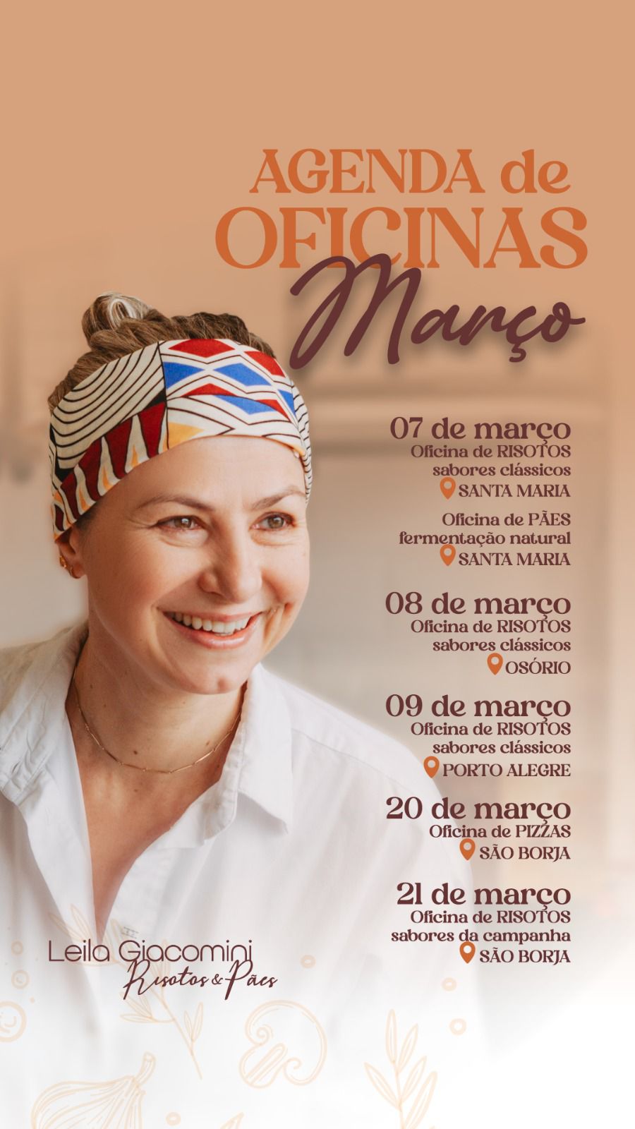 Ela ministra cursos por todo o Brasil, tendo os risotos como seu principal carro-chefe. Leila, aliás, já esteve na cidade e retorna para mais uma temporada de ensinamentos culinários.
